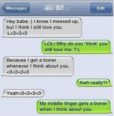 Looking for ex boyfriend quotes that will help you get over him? You can make your boyfriend to laugh out loud by telling him the funny and witty knock knock jokes. I have just had a tattoo of a sea shell on the inside of my leg at the top.. Check them out, rate them and share your favorite ones. Of course, you love teasing him just as much as you love his kind heart. Do you see us getting back together? Hope you enjoy these funny jokes to tell your boyfriend. At some point of dating some of us really start wondering if we are boring our boyfriends to death. It s just his way of letting you realize he saved you from the wrong one. We know you're pretty, that's one of the reason's we're going out with you. 25 funny insulting ex boyfriend quotes. If he was your first, it is okay to look for someone else who can understand you better. Newest funny jokes of the day.